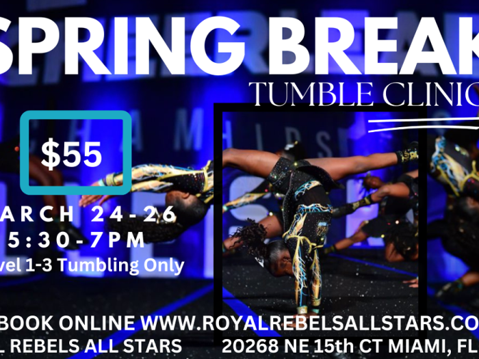 Sign up for our Spring Break Tumble Clinic to advance your tumbling skills for the upcoming season.
